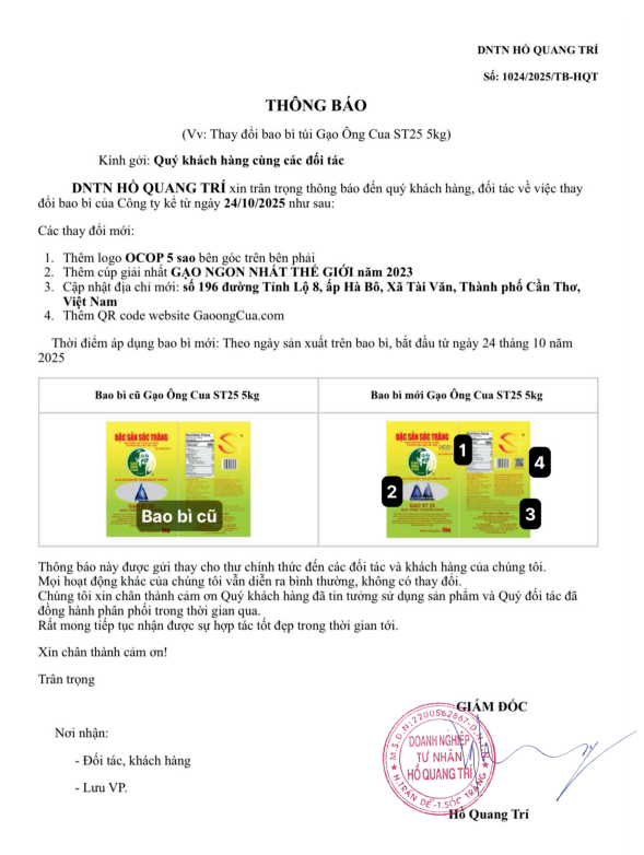 Theo thông báo mới của doanh nghiệp tư nhân Hồ Quang Trí về việc thay đổi mẫu bao bì mới của công ty kể từ ngày 24/10/2025 như sau: